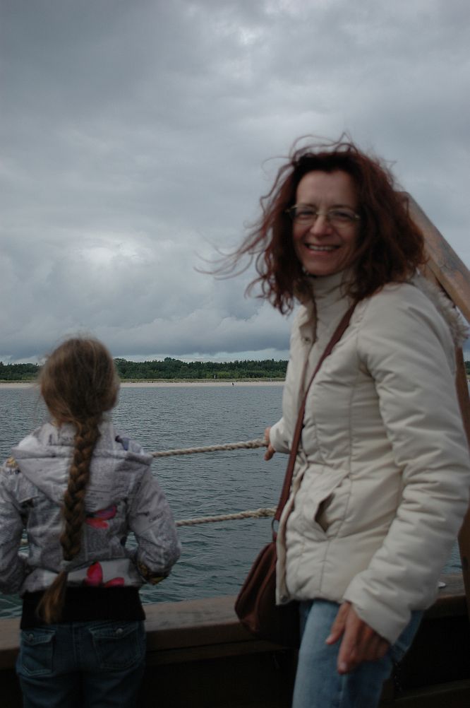 wciągnięta, względnie wepchnięta przez pana, który naganiał na rejs.